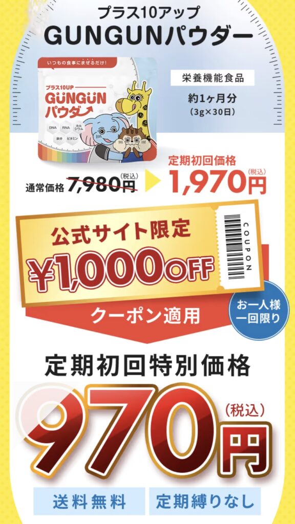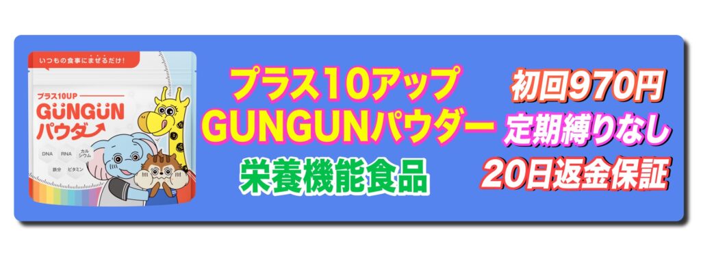 プラス10アップGUNGUNパウダーを初回970円でゲットする。公式サイトはこちら。