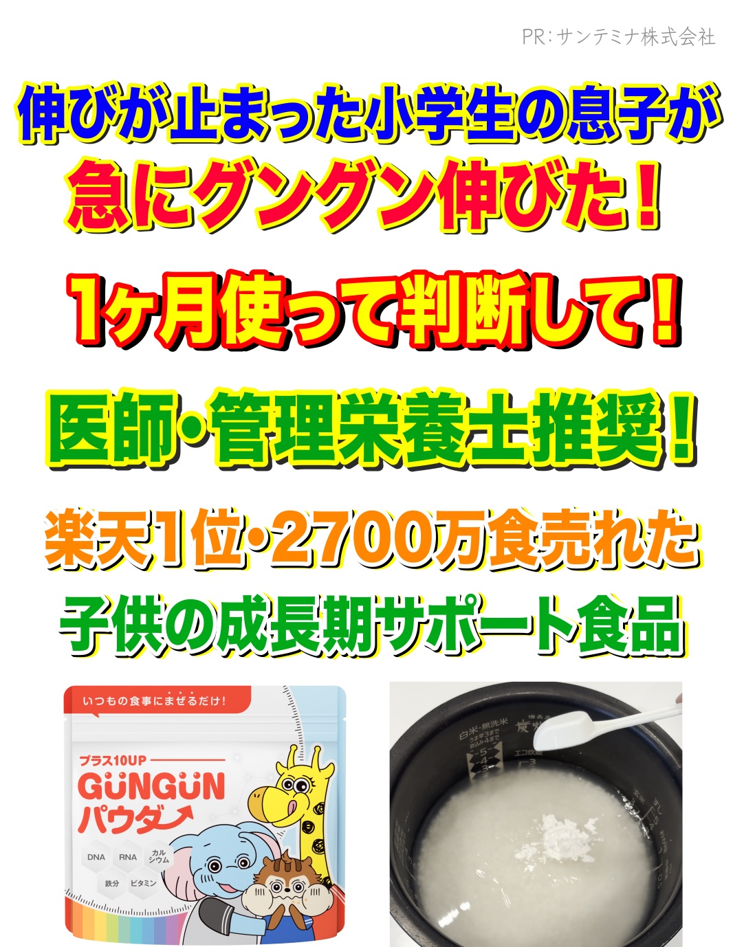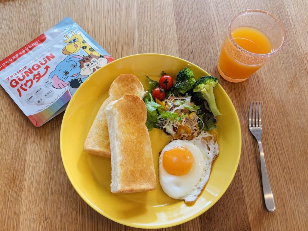 でも『プラス10アップGUNGUNパウダー』は無味無臭だからご飯にかけるだけのひとさじ栄養!